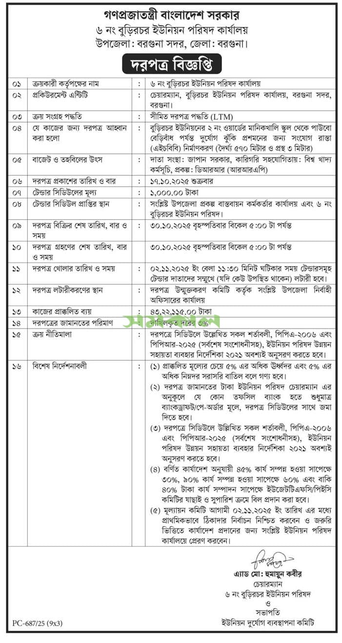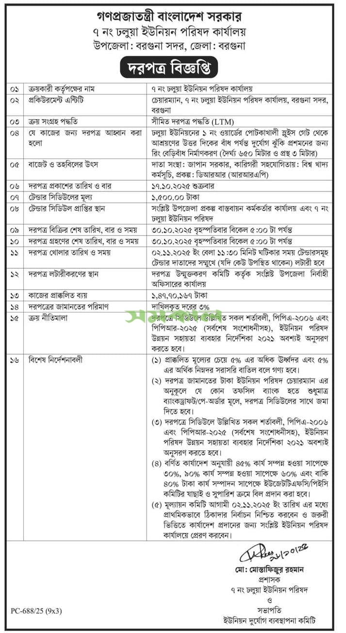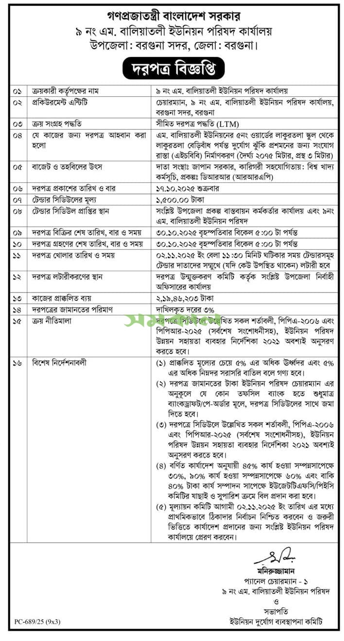 টেন্ডার ইউনিয়ন পরিষদ ও উপজেলা বাস্তবায়ন কর্মকর্তা-এর অফিসে পাওয়া যাবে। তবে টেন্ডার জমা দিতে হবে উপজেলা বাস্তবায়ন কর্মকর্তা-এর অফিসে। ১৭/১০/২০২৫ থেকে ৩০/১০/২০২৫ এর মধ্যে যেকোনদিন টেন্ডার জমা দেয়া যাবে। বিস্তারিত তথ্য টেন্ডার ফর্মের সাথে সংযুক্ত থাকবে। নিচের লিংক থেকে সংবাদপত্রে প্রকাশিত টেন্ডার দেখুন: